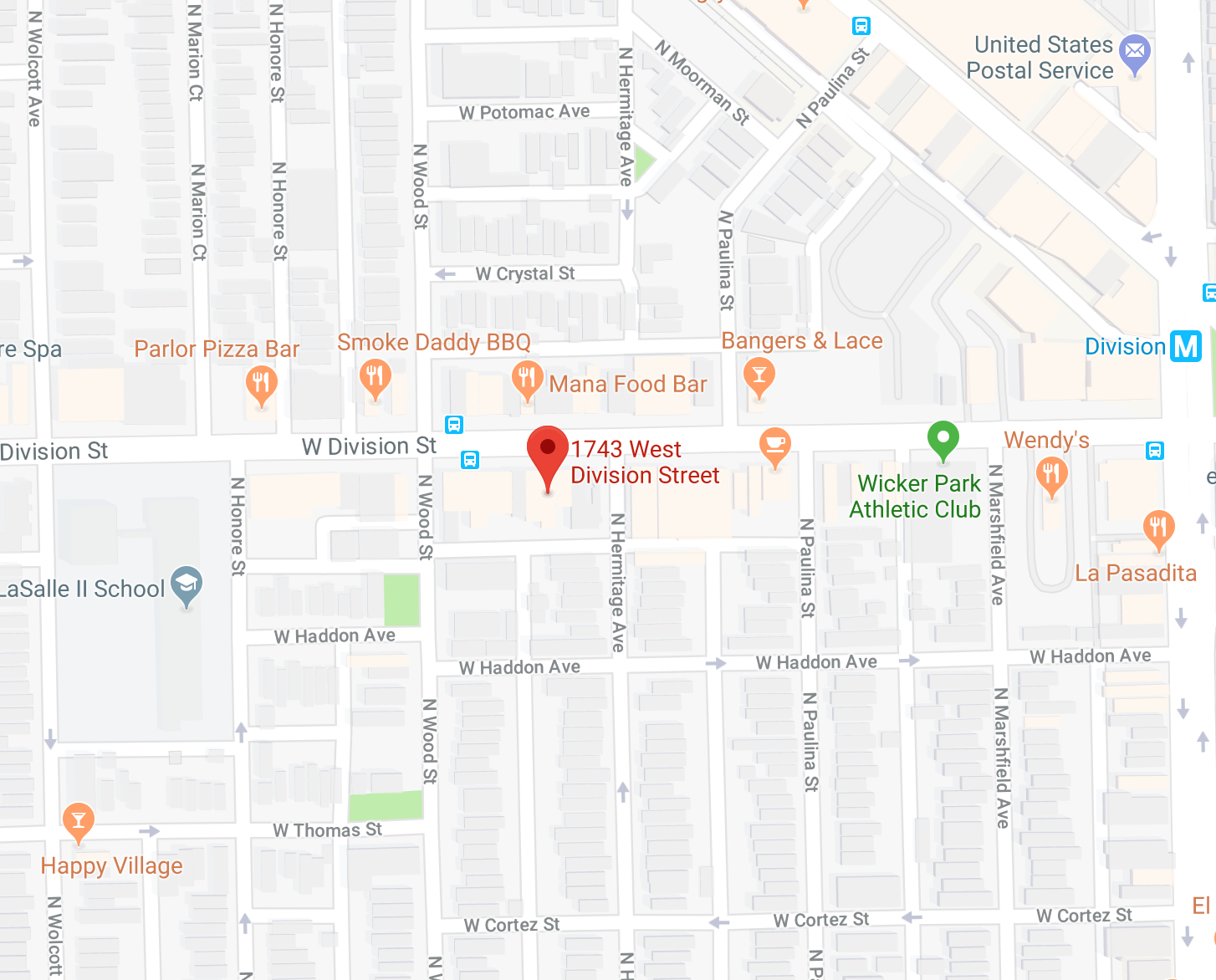Because this is located in Chicago, parking is scarce. The easiest thing to do would be to hire an Uber/Lyft/Taxi driver. If you decide to drive, you can use Spot Hero once you get to the area to find parking areas. You can also take the train (Blue Line exit at Division St – walk 4 blocks west to center).